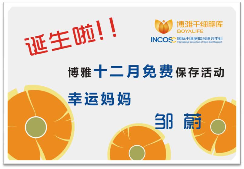 2011年1月4日,在新的一年的第一個(gè)工作日,十二月的博雅干細胞免費保存活動(dòng)的幸運媽媽產(chǎn)生了,這位幸運媽媽就是在無(wú)錫市人民醫院待產(chǎn)的鄒蔚準媽媽。謹此獻上博雅干細胞庫全體員工對她的衷心祝賀及對寶寶的美好祝愿。