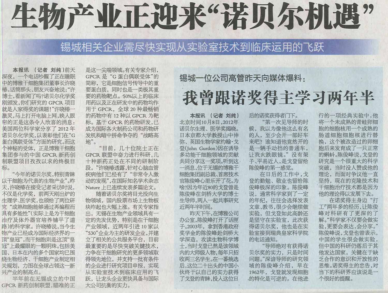 ??????? 前天深夜,一個(gè)電話(huà)吵醒了正在睡眠中的博雅干細胞集團董事長(cháng)許曉椿。話(huà)筒那頭,朋友興奮地說(shuō):“許博士,看新聞了嗎?諾貝爾化學(xué)獎剛頒發(fā),你們研究的GPCR項目就是人家得獎的課題!”許曉椿一激靈,馬上打開(kāi)電腦上網(wǎng),映入眼簾的正是這條令人欣喜的消息:美國兩位科學(xué)家分享了2012年諾貝爾化學(xué)獎,以表彰他們在“G?蛋白偶聯(lián)受體”方面的研究。而這個(gè)神秘的受體,正是博雅干細胞集團參與的中國GPCR新藥創(chuàng )制聯(lián)盟項目孜孜以求的終極目標。