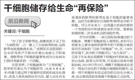 ??????? “存了孩子的臍帶血,就像給孩子買(mǎi)了份‘大病醫?!?,萬(wàn)一患上了白血病等疾病,這些臍帶血就能挽救生命?!背啥架妳^總醫院的一位42歲母親產(chǎn)子救20歲患白血病兒子的故事,使臍帶血干細胞的重要性成為白血病友們探討得最多的一個(gè)話(huà)題。