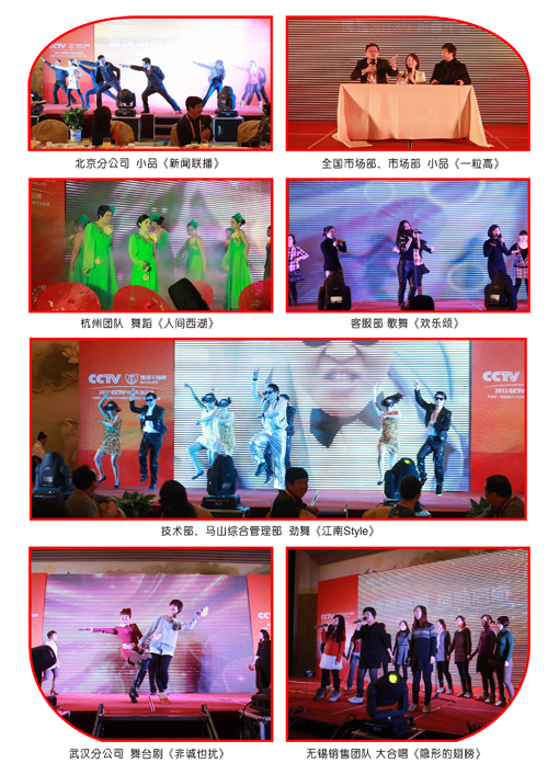 ??????? 年會(huì )上,精彩的文藝節目一個(gè)接一個(gè)上演,領(lǐng)導及員工的祝福視頻瞬間讓年會(huì )現場(chǎng)充滿(mǎn)了溫暖,技術(shù)部、馬山綜合部表演的勁舞《江南Style》激情澎湃、熱情四射,博得了現場(chǎng)陣陣掌聲;客服部表演的《快樂(lè )頌》為現場(chǎng)帶來(lái)了天外來(lái)音,美妙動(dòng)聽(tīng);全國市場(chǎng)部、市場(chǎng)部聯(lián)袂表演的小品《一粒高》,詼諧有趣,讓人忍俊不禁;杭州團隊表演的舞蹈《人間西湖》,浪漫優(yōu)雅的意境,讓大家感覺(jué)已置身西湖;北京分公司表演的小品《新聞聯(lián)播》,風(fēng)格大膽,充滿(mǎn)創(chuàng )意,給大家帶來(lái)了一個(gè)別具一格的《新聞聯(lián)播》;武漢分分公司的《非誠也擾》驚艷登場(chǎng),美女如云,為大家表演了一場(chǎng)高規格的博雅版相親真人秀,讓人耳目一新;無(wú)錫銷(xiāo)售團隊精心準備的歌曲——《隱形的翅膀》,歌聲溫暖而富有激情,帶領(lǐng)博雅人在2013年放飛夢(mèng)想。整個(gè)年會(huì )現場(chǎng)精彩紛呈,好戲不斷……,隨后的游戲互動(dòng)環(huán)節,更是將會(huì )場(chǎng)氣氛升華到了高潮,博雅員工用心投入的表演展現著(zhù)博雅人創(chuàng )新、自信的風(fēng)采。