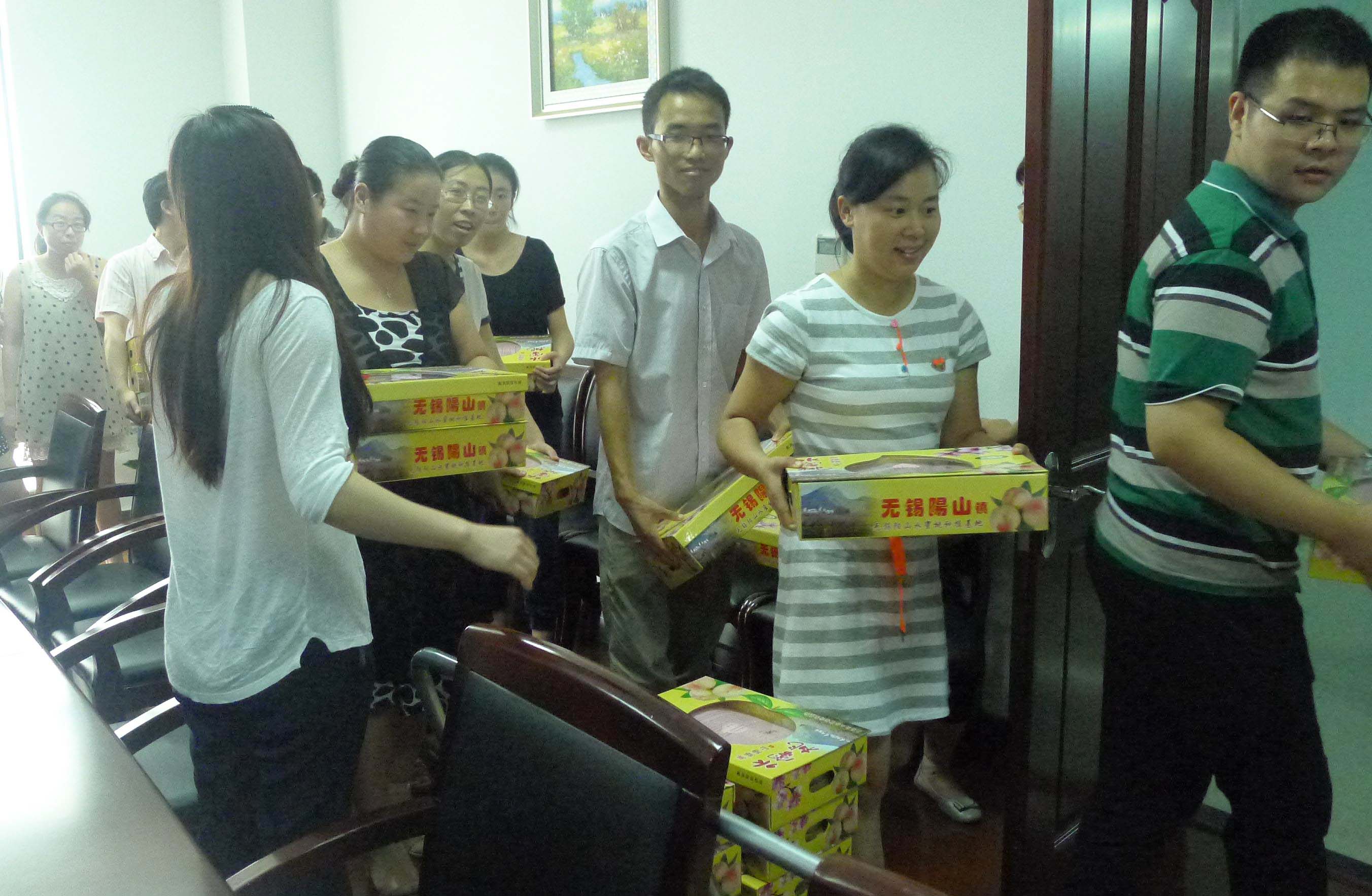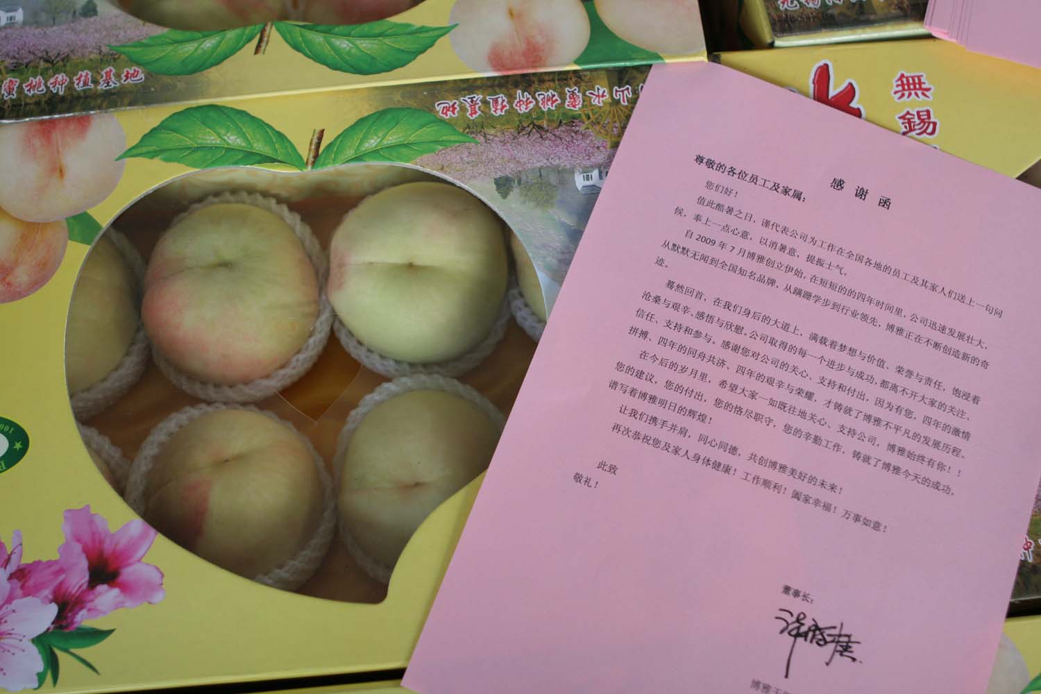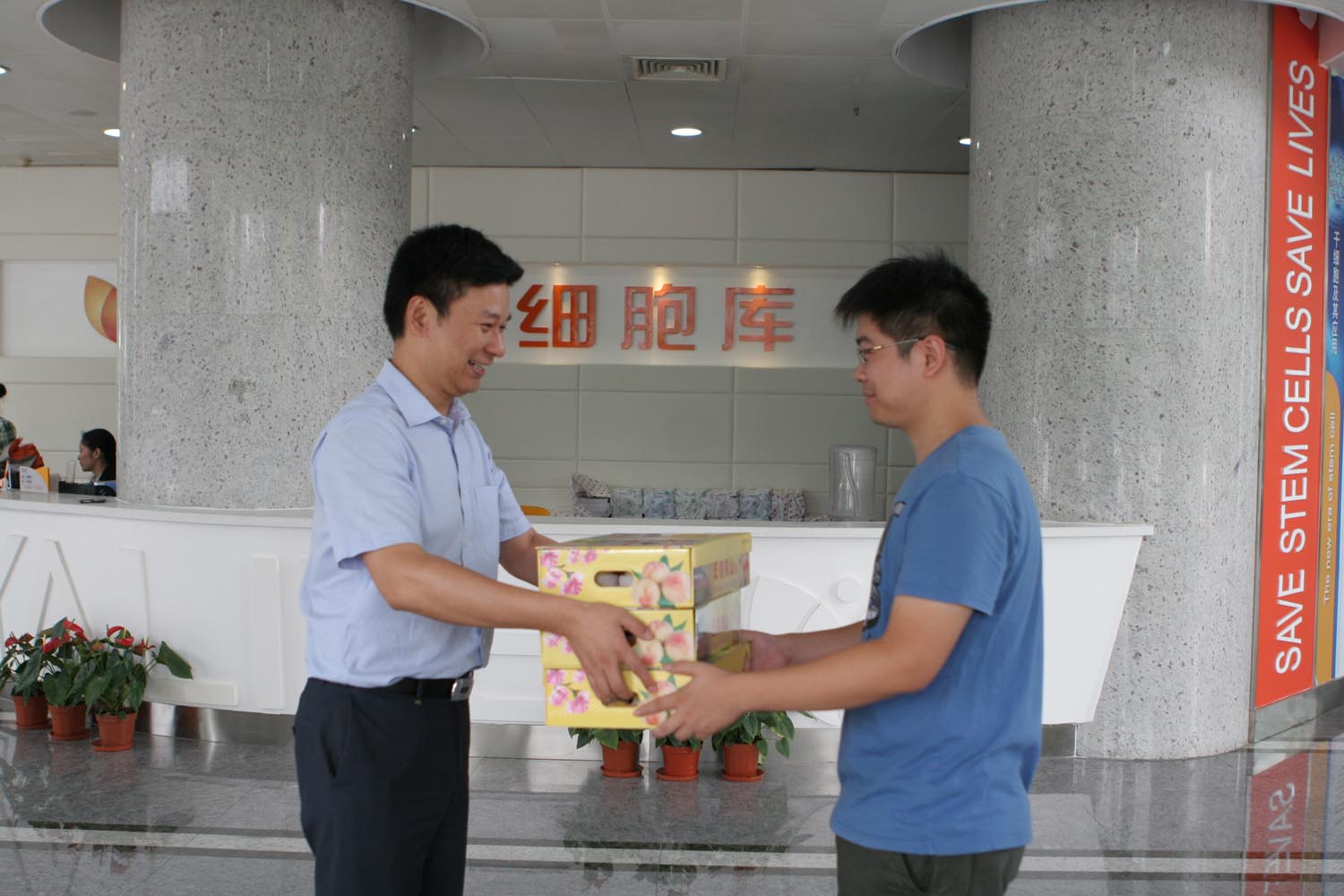 ??????? 8月2日,博雅干細胞集團副總裁王謀在公司總部為員工發(fā)放夏季福利,當每一位員工領(lǐng)到剛從陽(yáng)山果樹(shù)上摘下的水蜜桃,并收到一封董事長(cháng)的感謝信時(shí),大家切身感受到了來(lái)自公司的關(guān)懷和溫暖。