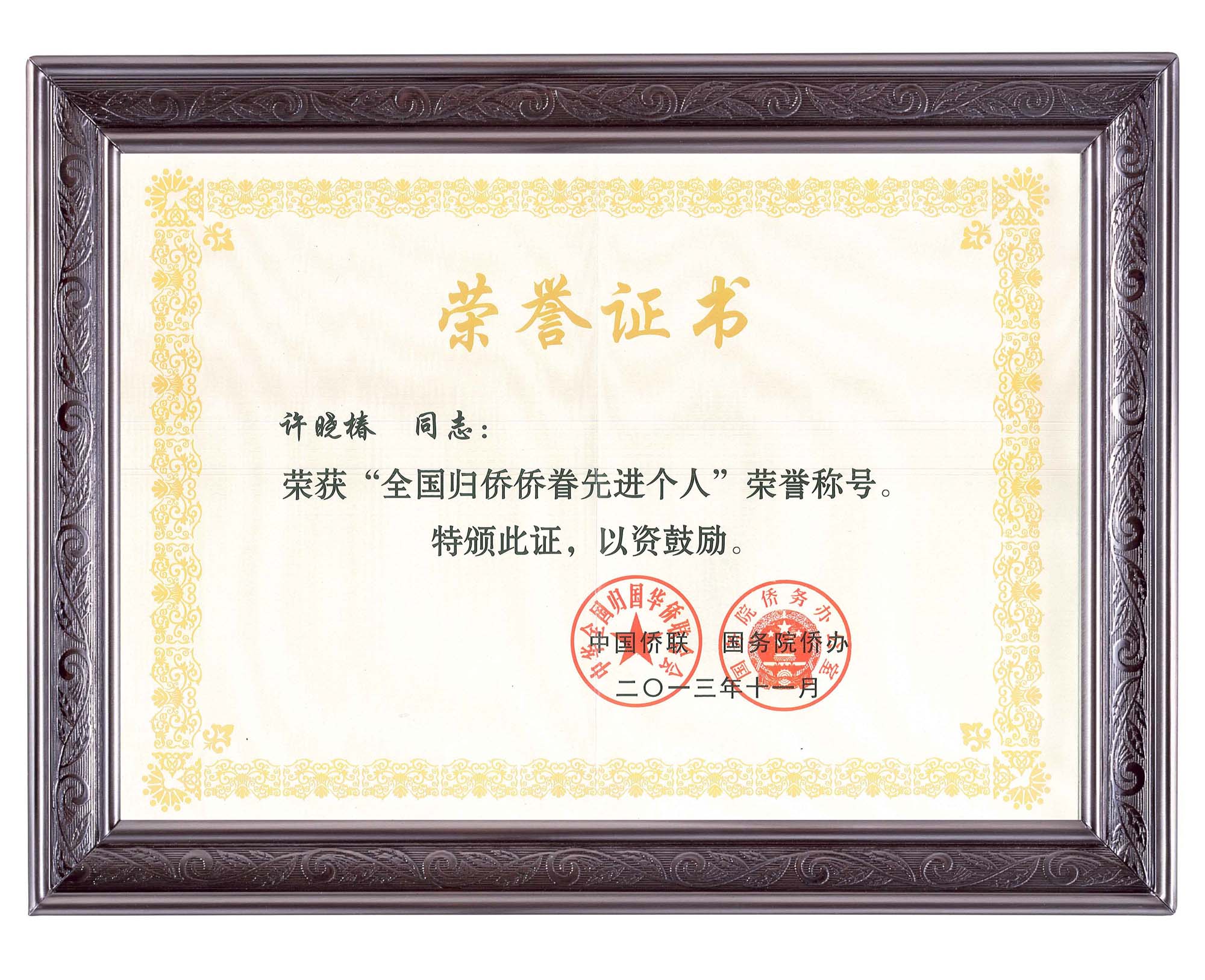 ??????? 許曉椿博士榮獲“全國歸僑僑眷先進(jìn)個(gè)人”稱(chēng)號后自豪和感激之情溢于言表,他表示,將一如既往地團結廣大歸僑僑眷和海外僑胞,發(fā)揚熱愛(ài)中華、振興中華的愛(ài)國愛(ài)鄉傳統,抓住祖國全面深化改革開(kāi)放的新機遇,在自身涉足的發(fā)展領(lǐng)域——生命健康產(chǎn)業(yè)技術(shù)領(lǐng)域,不斷開(kāi)拓創(chuàng )新,攜手海內外中華兒女共同奮斗,為早日實(shí)現中華民族偉大復興的中國夢(mèng)而不斷努力。