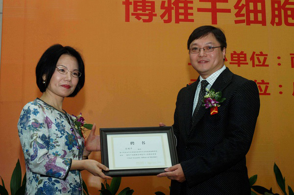 博雅干細胞集團董事長(cháng)許曉椿博士(右)為肖瑞平教授頒發(fā)聘書(shū)