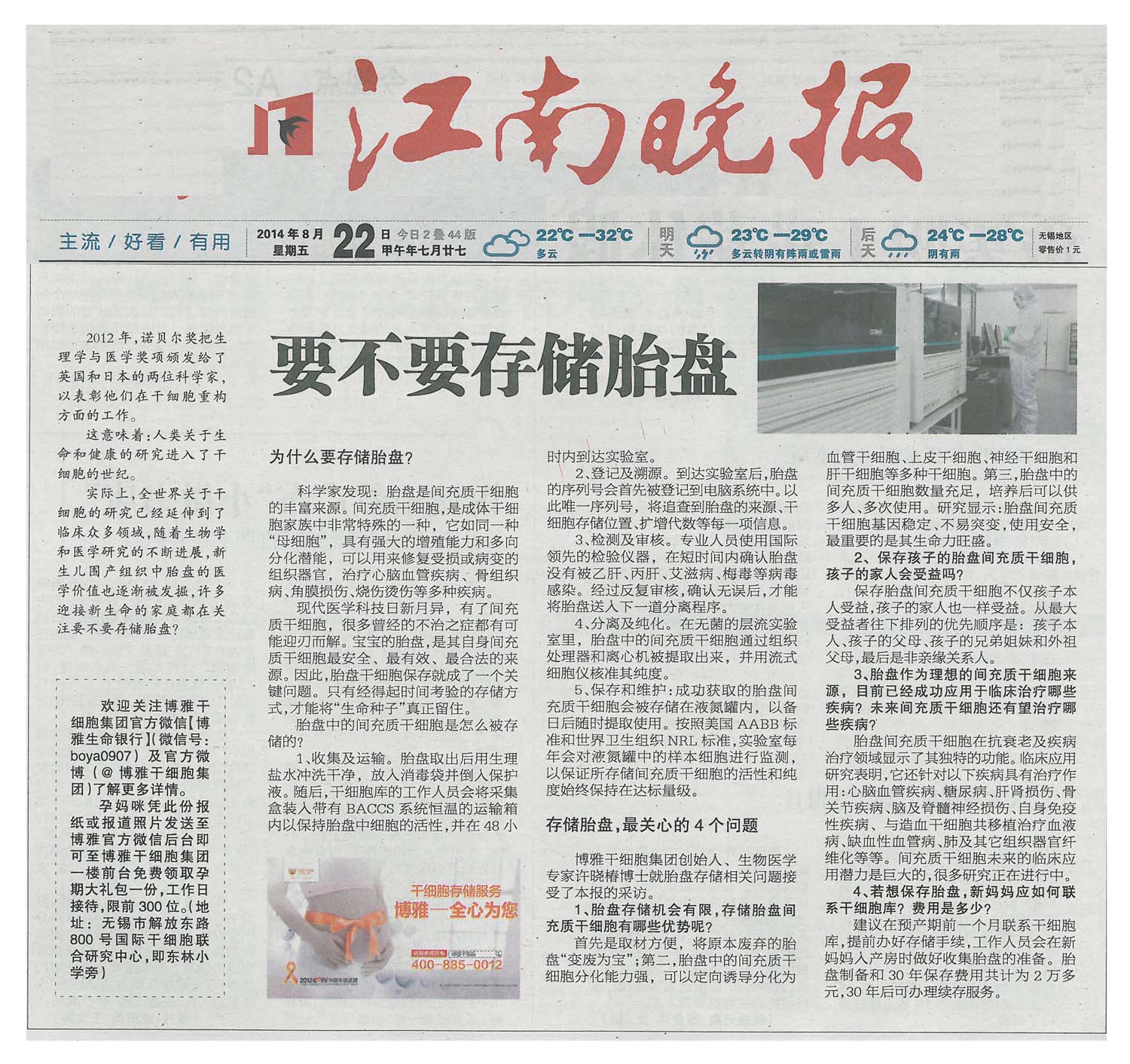 ????? ??建議在預產(chǎn)期前一個(gè)月聯(lián)系干細胞庫,提前辦好存儲手續,工作人員會(huì )在新媽媽入產(chǎn)房時(shí)做好收集胎盤(pán)的準備。胎盤(pán)制備和30年保存費用共計為2萬(wàn)多元,30年后可辦理續存服務(wù)。?