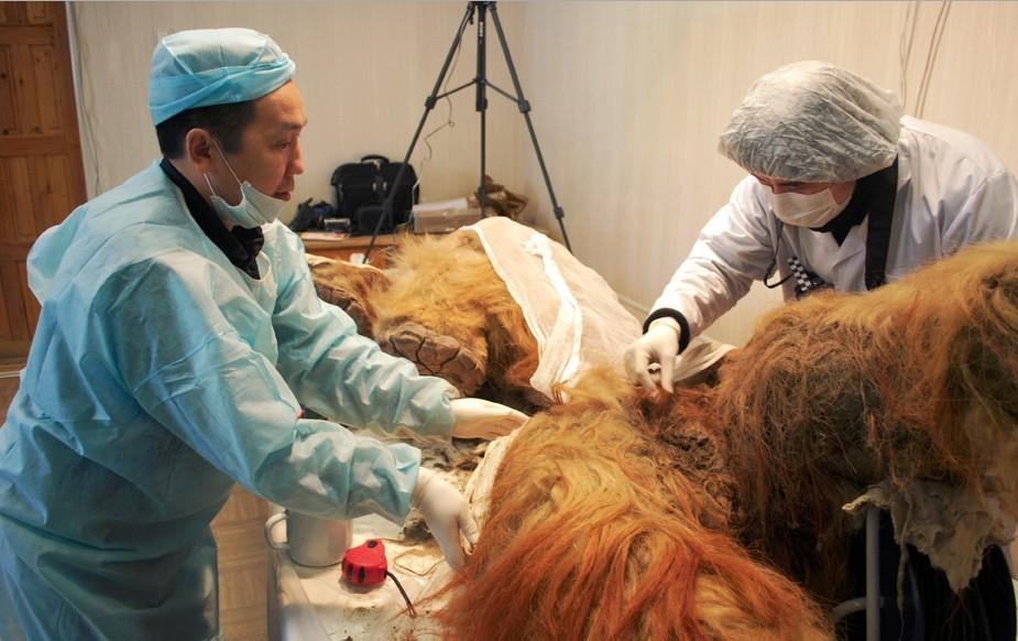 圖:韓國秀巖團隊(藍色實(shí)驗服)與俄羅斯科學(xué)家(白色實(shí)驗服)在俄羅斯挖掘出3.9萬(wàn)年前猛犸象