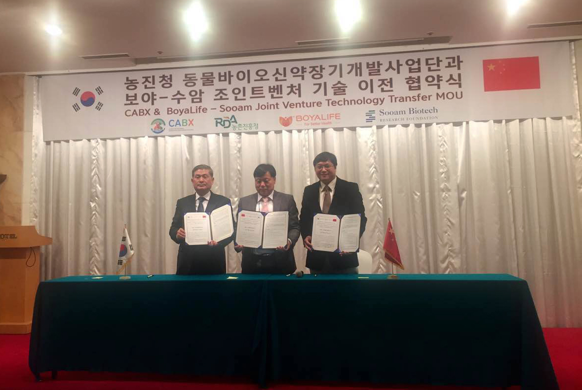 ? ? ? ? 本次會(huì )議上,博雅干細胞集團與韓國秀巖生命工學(xué)研究院(Sooam?Biotech?Research?Foundation)簽署正式投資協(xié)議,在未來(lái)三年內向韓國秀巖生命工學(xué)研究院投入研究經(jīng)費,支持克隆技術(shù)研發(fā)與產(chǎn)業(yè)轉化。此外,博雅干細胞集團、韓國秀巖生命工學(xué)研究院與韓國農政廳下一代綠色生物21事業(yè)動(dòng)物生物新藥臟器開(kāi)發(fā)事業(yè)團簽署了關(guān)于動(dòng)物克隆與干細胞應用技術(shù)開(kāi)發(fā)與應用以及技術(shù)轉讓的三方合作協(xié)議。動(dòng)物生物臟器新藥開(kāi)發(fā)事業(yè)團團長(cháng)金南衡教授表示,此次三方合作是基于對動(dòng)物生命科學(xué)技術(shù)的良好前景展望,通過(guò)中韓強強聯(lián)手來(lái)實(shí)現技術(shù)成果轉化。