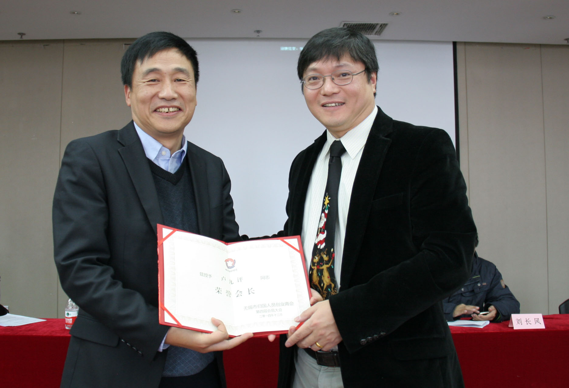 許曉椿會(huì )長(cháng)(右)為上屆無(wú)錫市歸國人員創(chuàng )業(yè)商會(huì )會(huì )長(cháng)盧九評(左)頒發(fā)榮譽(yù)會(huì )長(cháng)證書(shū)