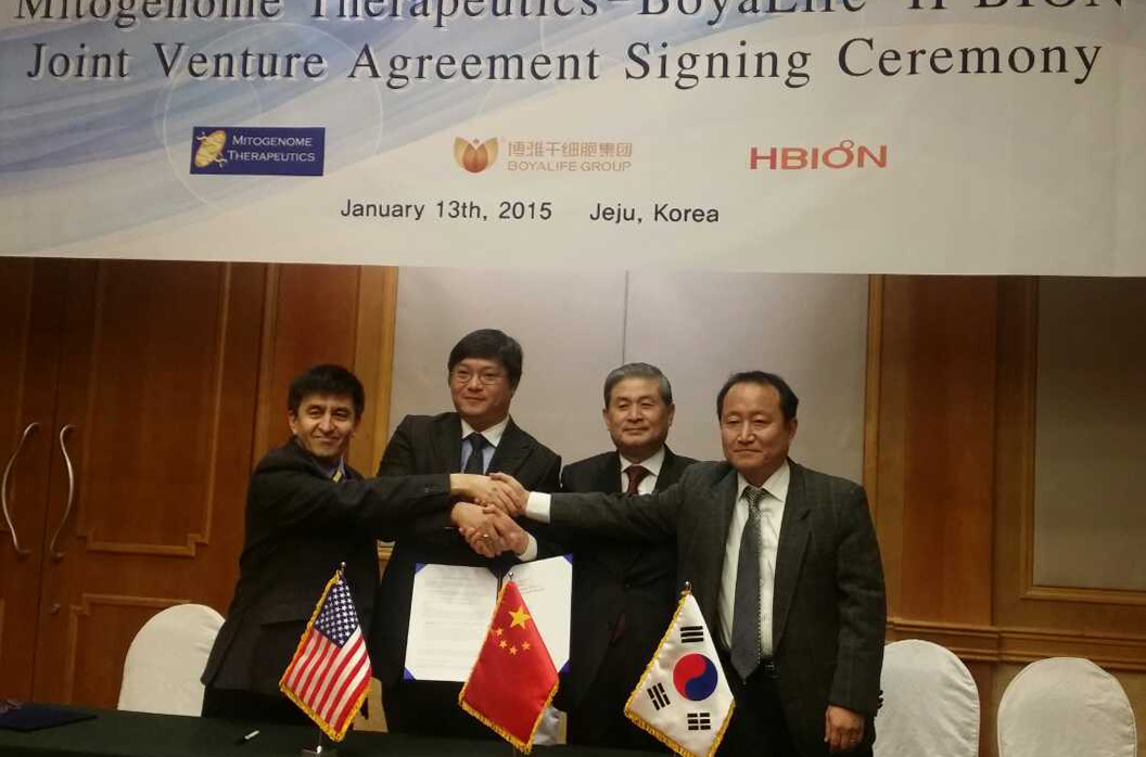 ? ? ? ? 1月13日,博雅干細胞集團、美國俄勒岡健康與科學(xué)大學(xué)(Oregon?Health?&?Science?University,OHSU)和韓國慶尚大學(xué)獸醫學(xué)院(Gyeongsang?National?University)在韓國濟州島RAMADA酒店簽訂中美韓三方合作協(xié)議,就三方共同推動(dòng)干細胞技術(shù)在線(xiàn)粒體疾病方面的應用達成一致。博雅干細胞集團董事長(cháng)許曉椿博士出席簽約儀式。