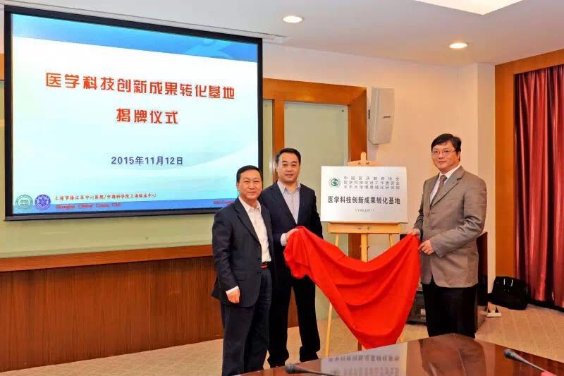 ??????? 中國醫藥教育協(xié)會(huì )醫學(xué)科技促進(jìn)工作委員會(huì )王延銳副秘書(shū)長(cháng),北大博雅轉化研究院理事長(cháng)、北大博雅控股集團董事長(cháng)許曉椿博士和上海徐匯區中心醫院院長(cháng)、醫促委常委朱福教授聯(lián)合宣布:“首個(gè)具有全國示范性的醫學(xué)科技創(chuàng )新成果轉化基地在上海徐匯區中心醫院落成”?;赝瑫r(shí)獲得轉化基金300萬(wàn)元,當天舉行了基地揭牌儀式,并就基地下一步工作的開(kāi)展舉行了座談。