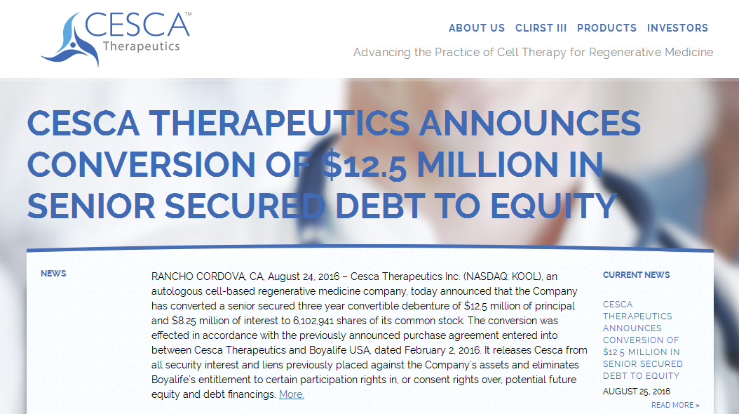? ? ? ? 近日,據《薩克拉門(mén)托商業(yè)周刊》報道,一家來(lái)自中國的干細胞集團今年年初向總部在美國加州蘭喬科爾多瓦市的Cesca?Therapeutics(NASDAQ:KOOL)?公司提供了一筆貸款,現在這個(gè)干細胞集團正式成為了Cesca的控股公司,并擁有70%的股權。
