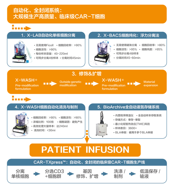 ??????? 博雅控股集團在高品質(zhì)細胞制造領(lǐng)域有著(zhù)豐富的運營(yíng)經(jīng)驗,2017年推出了CAR-T及免疫細胞治療自動(dòng)化整體解決方案CAR-TXpress?,并分別在美國加州及中國天津啟動(dòng)建設CAR-T自動(dòng)化生產(chǎn)線(xiàn)。全封閉、自動(dòng)化CAR-T生產(chǎn)線(xiàn)CAR-TXpress?擁有美國專(zhuān)利和商標局授予的多項創(chuàng )新專(zhuān)利,整合了多元化自動(dòng)化流程,包括T細胞的分離、純化、培養、洗滌以及單盒式自動(dòng)冷凍保存(-196℃)和檢索,能夠實(shí)現免疫細胞手工分離流程自動(dòng)化,實(shí)現全球第一條規?;疌MC自動(dòng)化制備工藝。