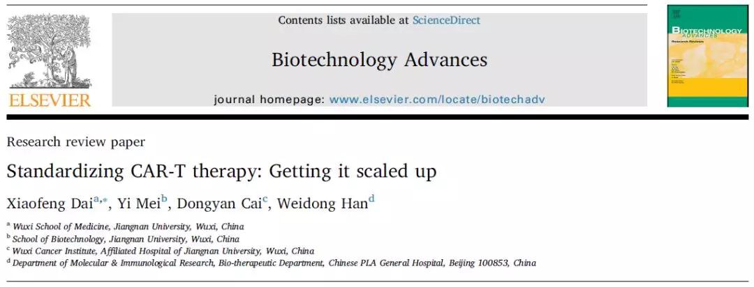 近日,江南大學(xué)的戴曉峰教授和解放軍總醫院的韓為東教授作為共同通訊作者在Biotechnology Advances(SCI一區,IF=11.452)發(fā)表了一篇題為:“Standardizing CAR-T therapy: Getting it scaled up(標準化CAR-T療法:擴大規模)”的文章,圍繞限制CAR-T的生產(chǎn)規模的問(wèn)題,回顧了當下的狀況和挑戰。