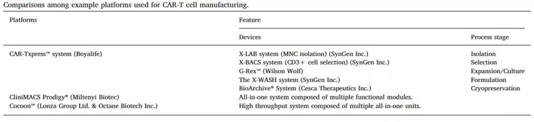 然而,盡管目前有許多選擇可以實(shí)現CAR-T(“制造過(guò)程”)的某些步驟的自動(dòng)化,但是使整個(gè)過(guò)程自動(dòng)化的設備相對較少。因此,為了創(chuàng )造最小化人為干預和易于使用的封閉環(huán)境,開(kāi)發(fā)覆蓋整個(gè)生產(chǎn)過(guò)程的制造系統是必要且具有挑戰性的。此外,關(guān)于細胞樣品自動(dòng)分析的監管協(xié)議能使自動(dòng)化制程中的決策成為可能,從而實(shí)現細胞治療產(chǎn)品的自動(dòng)化質(zhì)量控制,但目前仍然缺乏。