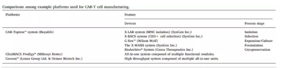 全球首個(gè)上市CAR-T藥物商業(yè)化碰壁,讓很多人意識到了優(yōu)化制造工藝的重要性。2018年12月,國內江南大學(xué)戴曉峰教授和解放軍總醫院韓為東教授聯(lián)名在著(zhù)名期刊《生物技術(shù)進(jìn)展》(Biotechnology Advances)上發(fā)表了一篇與CAR-T制造相關(guān)的論文[1],文中倡議使用封閉式自動(dòng)化系統,并列舉了當前市場(chǎng)上走在全球前沿的三個(gè)技術(shù)平臺,包括國內生物技術(shù)公司博雅控股集團旗下TG醫療(ThermoGenesis)自主研發(fā)的CAR-TXpress?平臺、德國美天旎生物的CliniMACS? Prodigy和瑞士Lonza與Octane Biotech合作開(kāi)發(fā)自動(dòng)生物反應器Co-coon?。