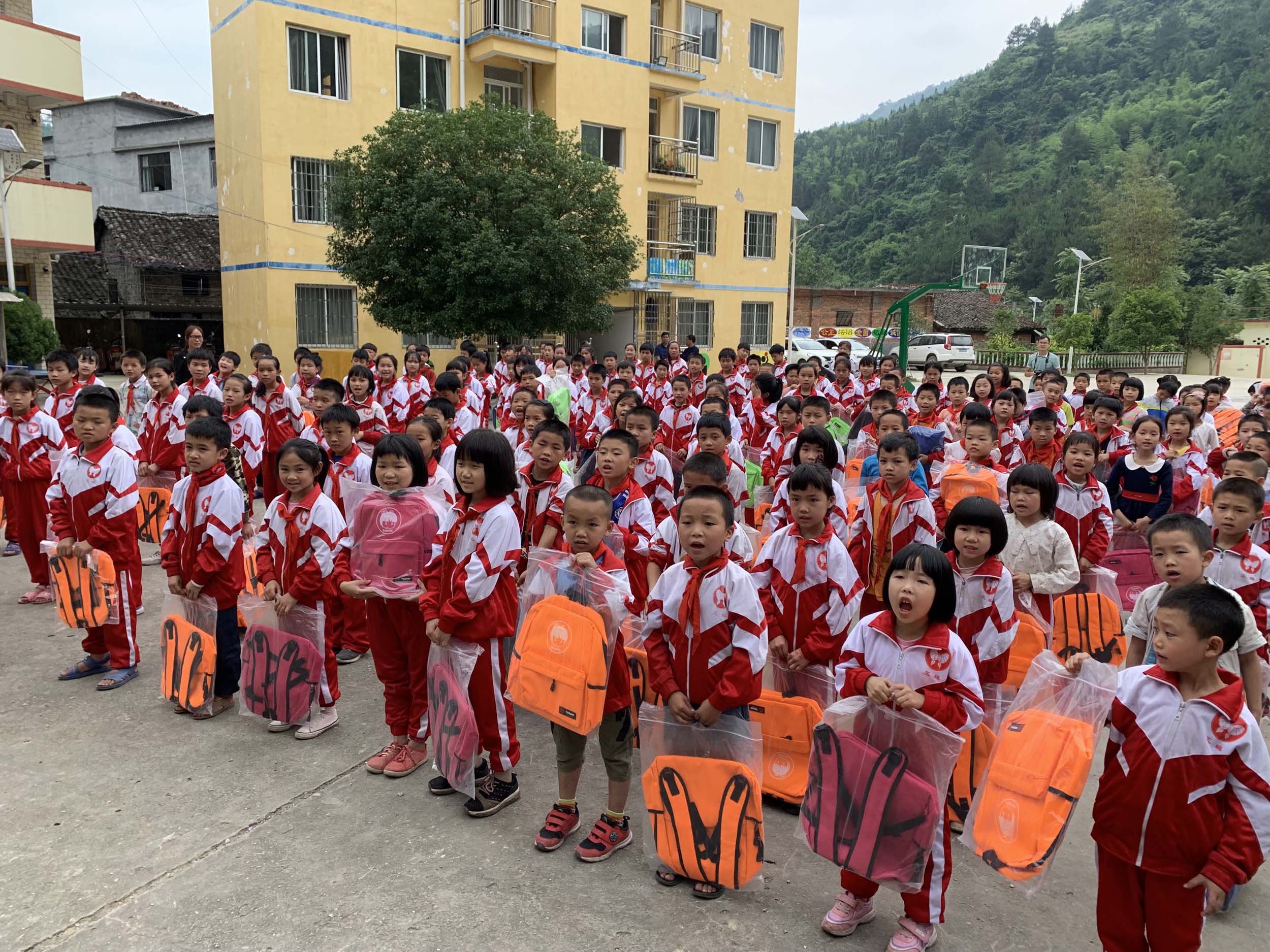 集團副總裁王謀(中)為孩子們發(fā)放書(shū)包