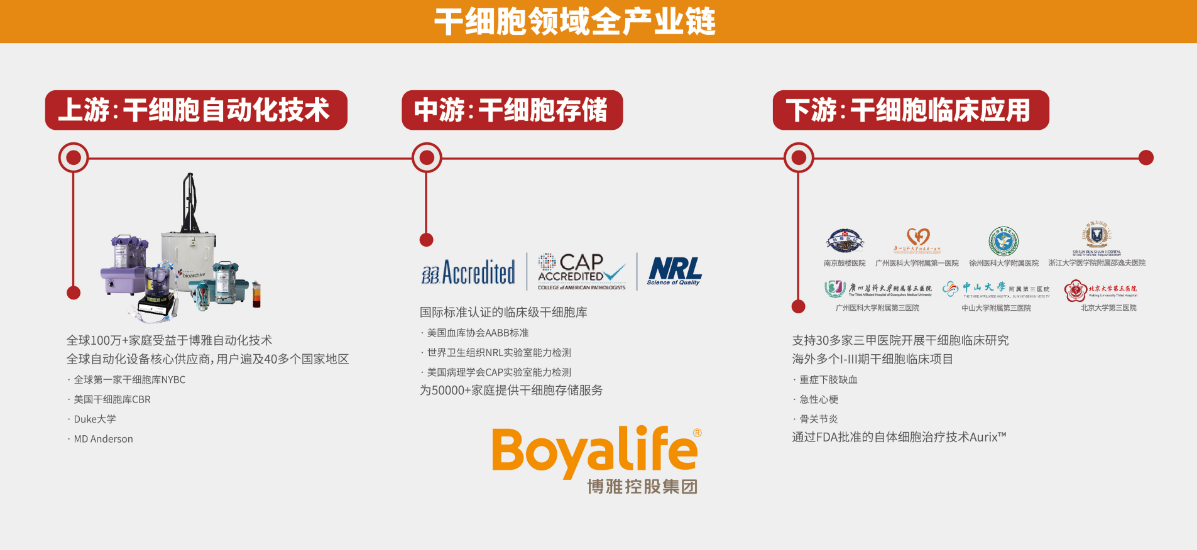 博雅控股集團是一家集自動(dòng)化技術(shù)、細胞制造、細胞存儲和細胞治療為一體的垂直整合的產(chǎn)業(yè)鏈企業(yè),覆蓋從干細胞自動(dòng)設備制造到干細胞臨床應用的產(chǎn)業(yè)鏈上中下游。在上游,博雅為行業(yè)提供臨床級生物樣本庫、手術(shù)室即時(shí)系統、CAR-T及腫瘤免疫細胞治療三大自動(dòng)化整體解決方案,代表著(zhù)干細胞領(lǐng)域未來(lái)的發(fā)展方向。在中游,博雅同時(shí)通過(guò)國際AABB、澳大利亞NRL、和美國病理學(xué)會(huì )CAP三大國際認證及實(shí)驗室能力檢測。在下游,博雅在全球范圍推動(dòng)臨床研究與應用,助力細胞治療臨床轉化。在海外,博雅也擁有多個(gè)獲得FDA審批進(jìn)入Ⅰ-Ⅲ期的干細胞臨床項目,其中干細胞治療下肢缺血的臨床獲得FDA批準進(jìn)入臨床Ⅲ期。在國內,博雅正在與30多家三甲醫院合作推動(dòng)干細胞臨床轉化。